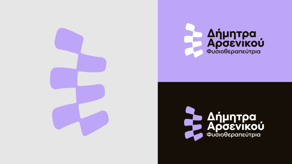 Το λογότυπο συνδυάζει καθαρές γραμμές και σύγχρονη τυπογραφία, προβάλλοντας επαγγελματισμό και εμπιστοσύνη. Η επιλογή της μωβ απόχρωσης ενισχύει την αίσθηση ηρεμίας και φροντίδας, ενώ το οργανικό σχήμα συμβολίζει την ανθρώπινη επαφή και την κίνηση, βασικά στοιχεία της φυσικοθεραπείας.